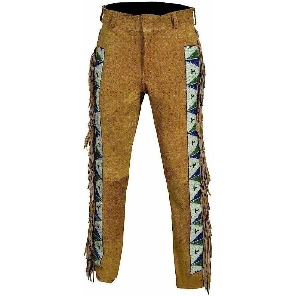 Men's Brown Western American Suede Leather Pant - Fringe & Beaded Detailing