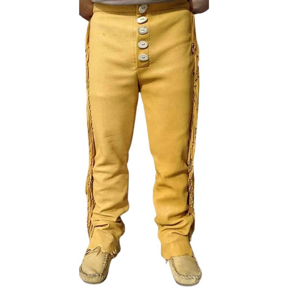 Men's Yellow Brown Western Cowhide Leather Pant with Fringe Working