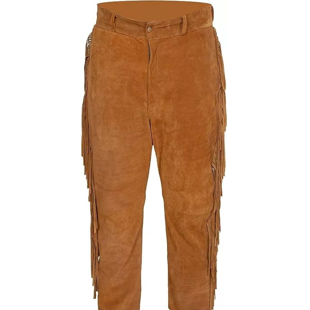 Men's Brown Western American Suede Leather Pant with Fringe Work