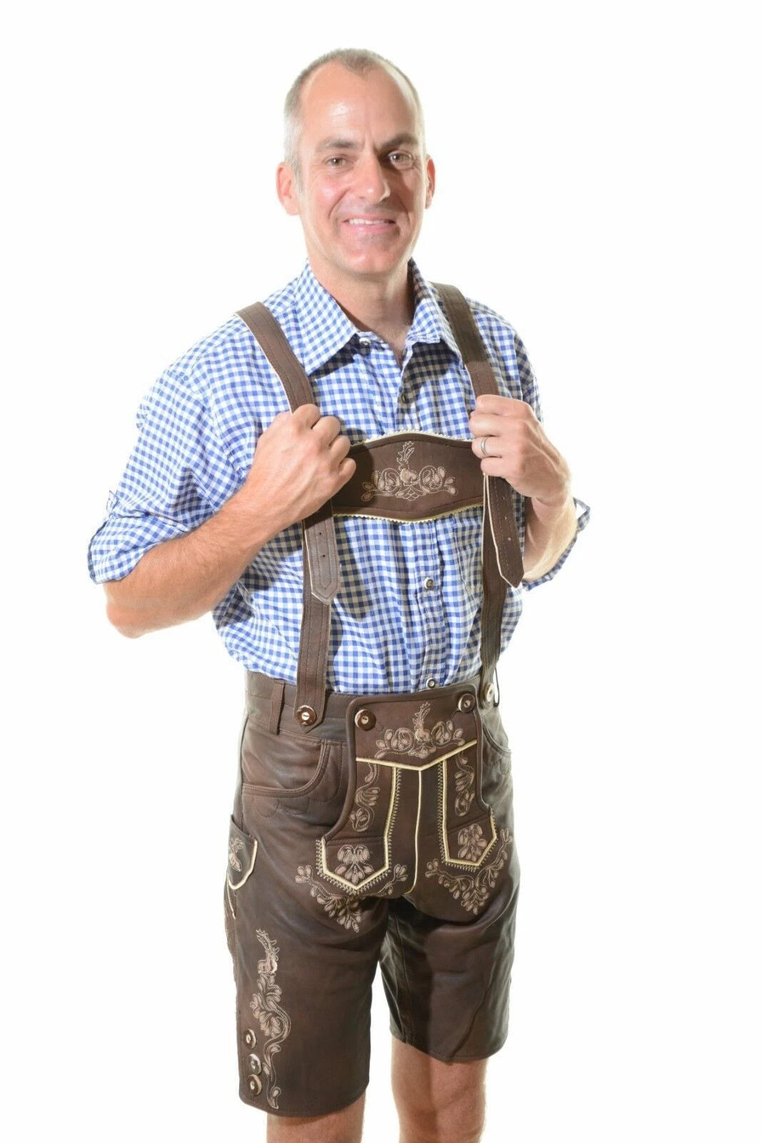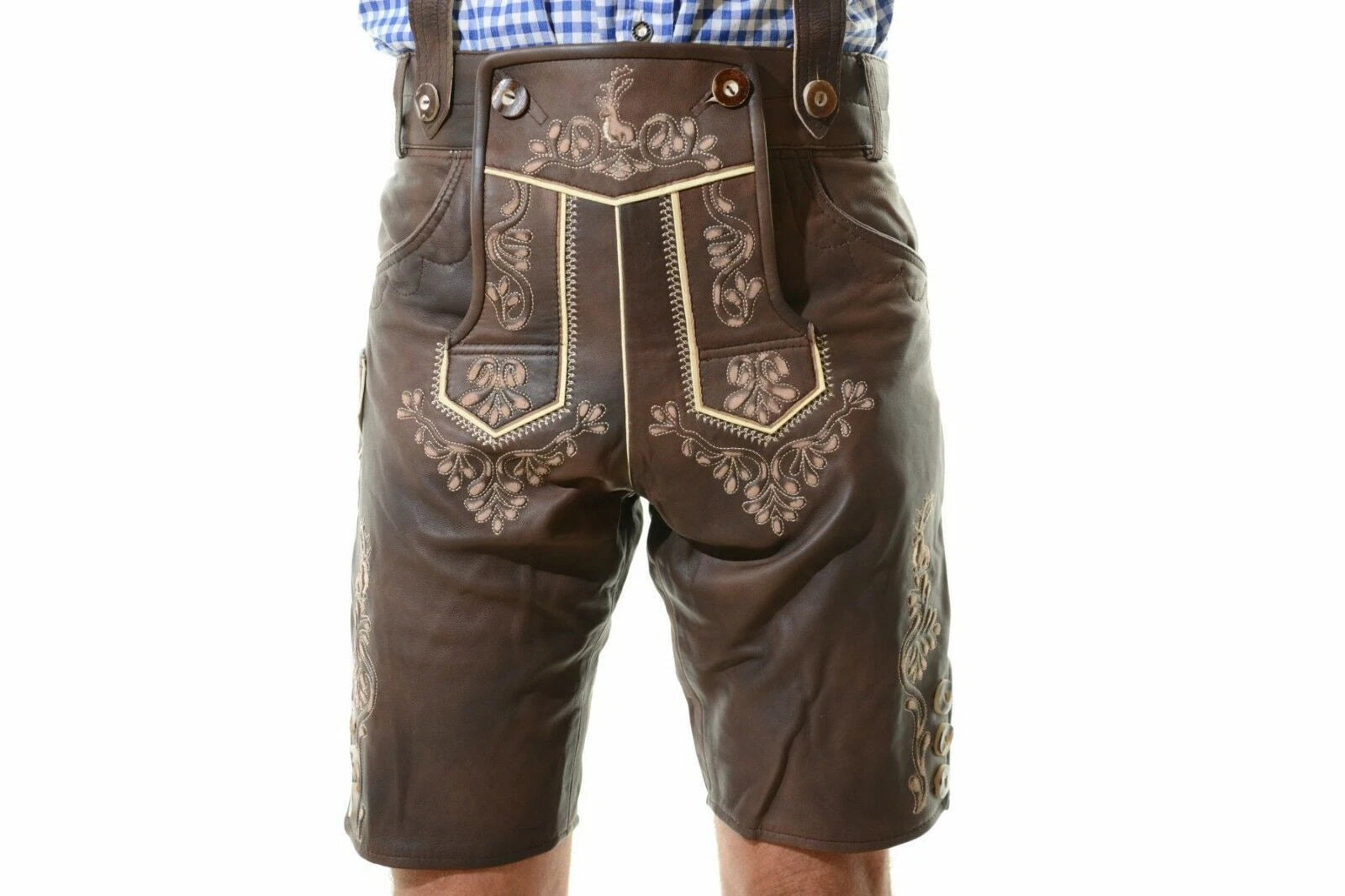 Celebrate authentic Bavarian heritage with this Oktoberfest Lamb Leather Lederhosen, a premium short German Tracht costume made for comfort, tradition, and timeless style. Crafted from high-quality genuine lamb leather, these Lederhosen feature detailed embroidery, classic horn-style buttons, and adjustable suspenders for the perfect fit.