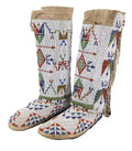 Authentic handmade Native American style beaded leather boots with colorful patterns. Perfect for powwow regalia, cultural wear, or collectors of traditional beadwork.