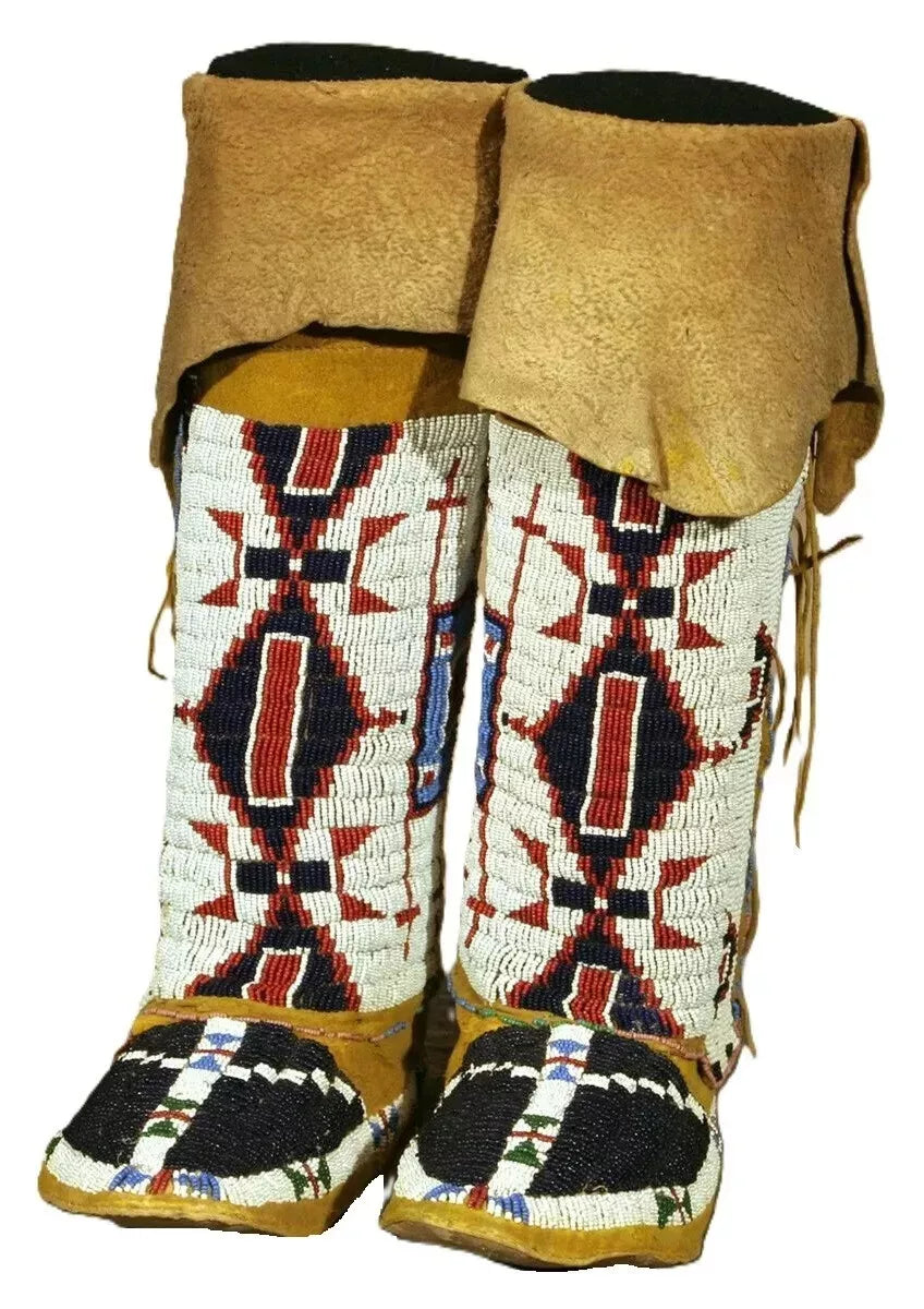 Authentic handmade Native American beaded leather Moccasins with colorful beadwork. Perfect for powwow regalia, traditional wear, or collectors of cultural fashion.