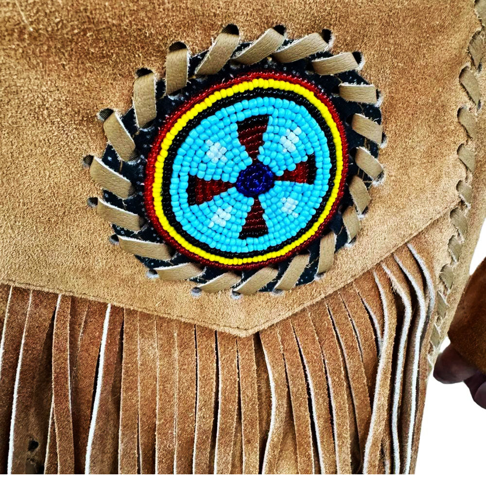 - Design: Western cowboy-inspired jacket with fringes, eagle beaded patterns, and bone leather details for an authentic look.