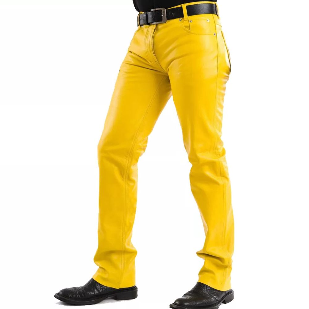 Elevate your style with our Men's Yellow Western American Style Cowhide Leather Pants, expertly crafted for comfort and durability. Made from 100% genuine high-quality cowhide leather, these pants are designed to offer a perfect blend of rugged charm and modern sophistication.