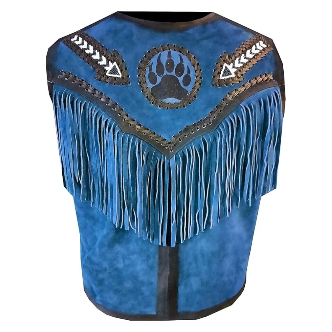 Step into Western heritage with our Men's Blue Tribal Western Suede Leather Fringe Vest — a bold fusion of cowboy style and tribal artistry. Handcrafted from premium-quality suede leather, this vest features dramatic fringes, traditional tribal beaded designs, and braided black leather accents. The snap-button closure and decorative shoulder patches elevate its vintage rodeo aesthetic, making it ideal for festivals, Western-themed events, or standout casual fashion. Whether you're a rodeo enthusiast or just love standout outerwear, this handmade vest is the ultimate statement piece.