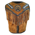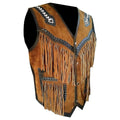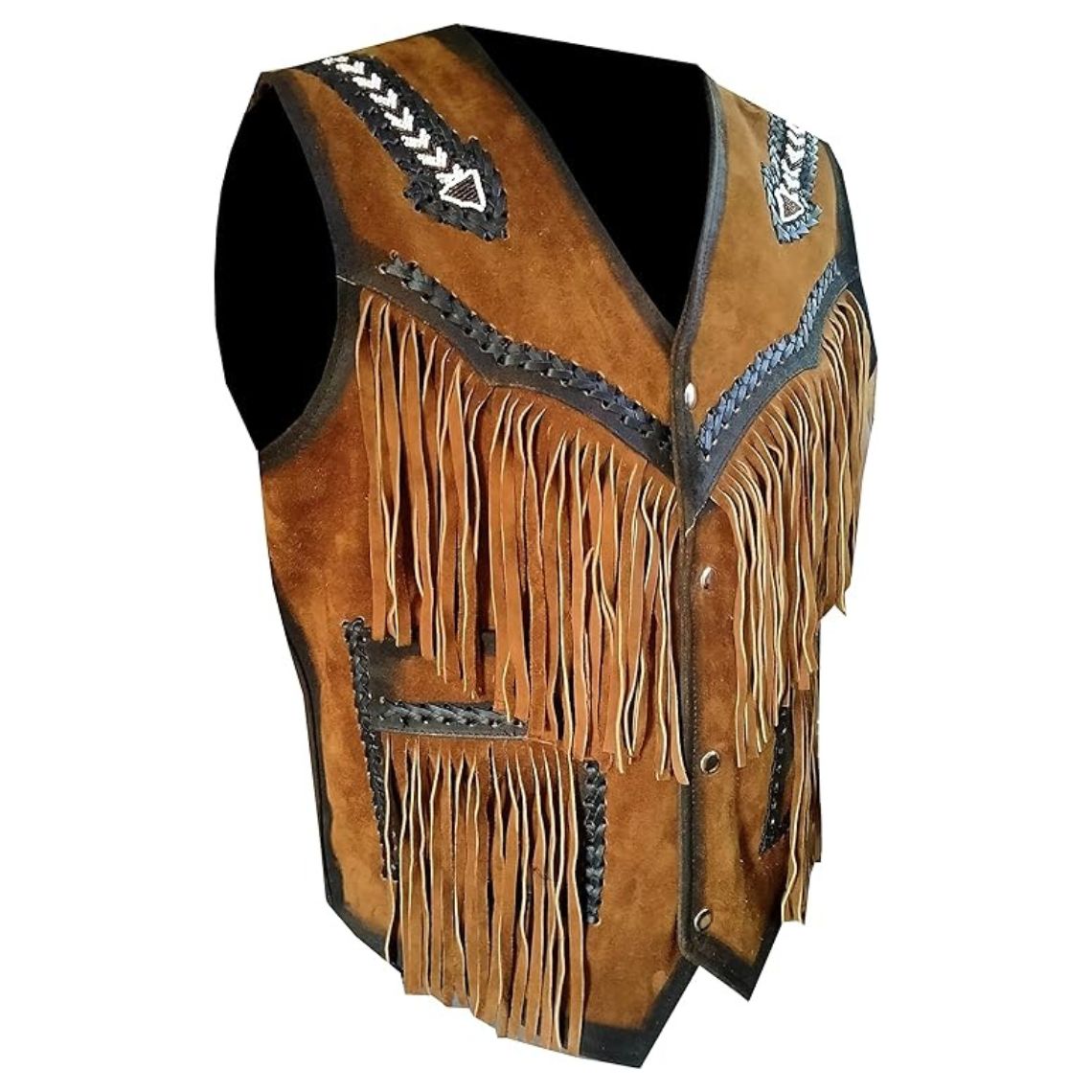 Men's Brown Western Suede Leather Fringe Vest Cowhide Patchwork Beaded Work
