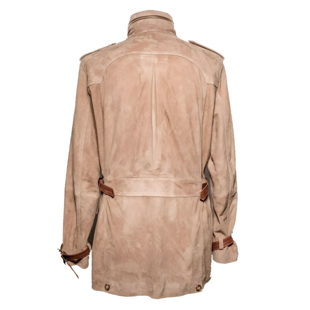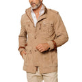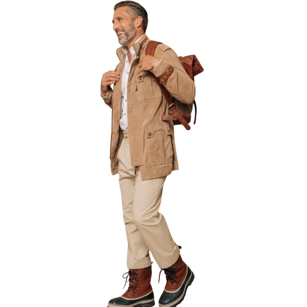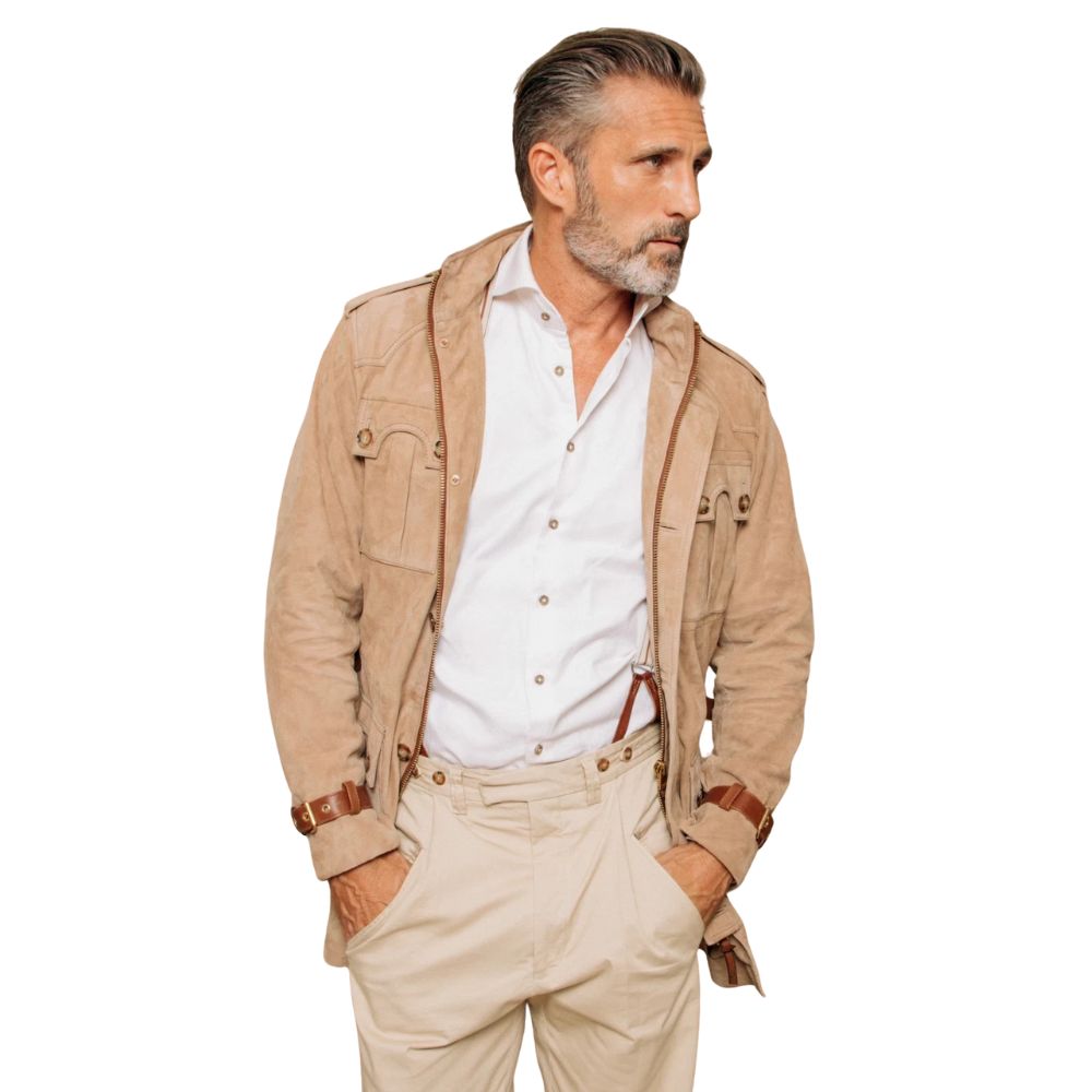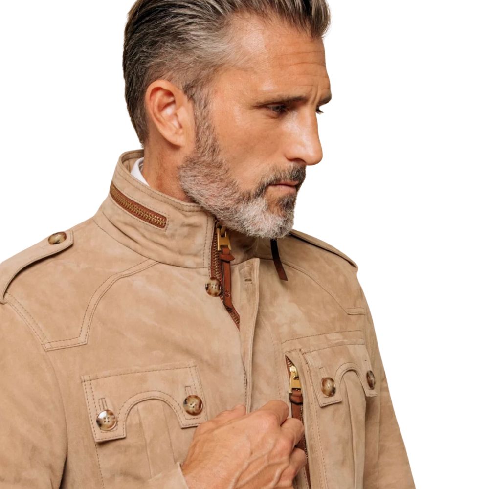 Men's Tan Suede Safari Style Leather Jacket with Button Closure & Buckle Straps