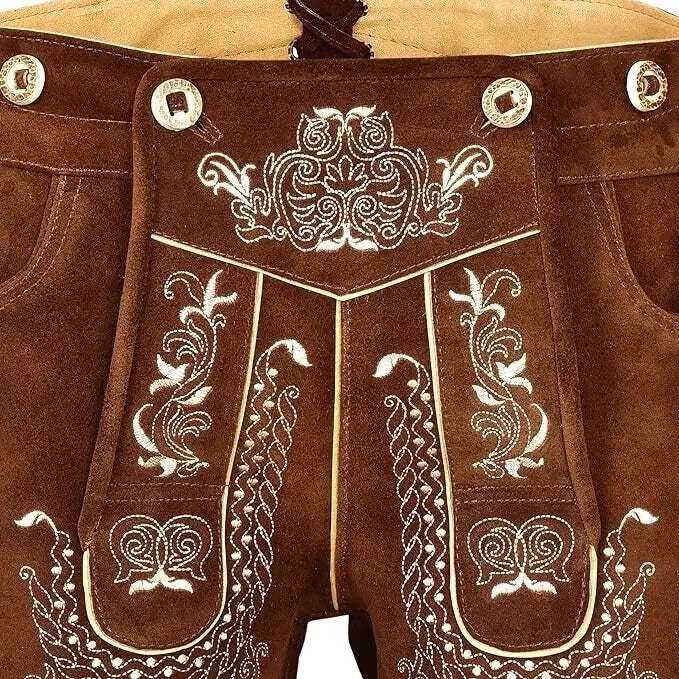 Celebrate Oktoberfest in true Bavarian style with this authentic Men's Suede Leather Lederhosen. Crafted from premium quality genuine suede, this traditional Trachten outfit features classic embroidery, adjustable suspenders, and button side closures for a perfect fit and long-lasting comfort.